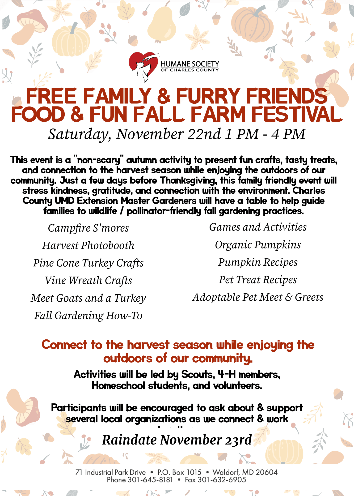 This event is a "non-scary" autumn activity to present fun crafts, tasty treats, and connection to the harvest season while enjoying the outdoors for our community. Just a few days before Thanksgiving, this family friendly event will stress kindness, gratitude, and connection with the environment. Edible organic pumpkins will be provided along with recipes for roasting seeds, cooking the pumpkin into pies, soup, muffins, or pet friendly (excellent for dogs & cats) snacks. There will be nature crafts such as pine cone turkeys, native vine wreath making, feather bead & leather craft, and a supervised campfire for making s'mores. Activities will be led by volunteers, Scouts and 4-H members. Charles County UMD Extension Master Gardeners will have a table to help guide families to wildlife / pollinator- friendly fall gardening practices. Adoptable pets will be available for live pet "meet & greet" interaction & cuddling from our local "no-kill" rescue shelter. Homeschool students will assist with games & activities with a straw bale photo booth. There will be friendly goats & a live turkey for petting. Participants will be encouraged to support several local non-profits as we connect & work together. since this is an outdoor event, raindate will be November 23.